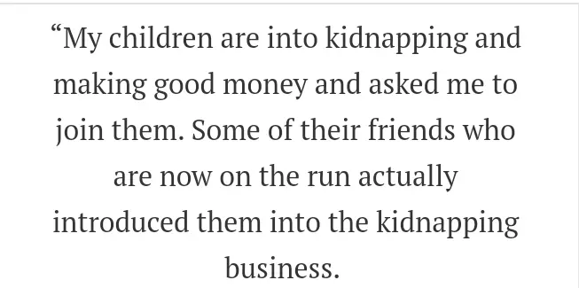He said the children were making a lot of money before asking him to join them. “My children are into kidnapping and making good money and asked me to join them. " he told Sun Newspaper.